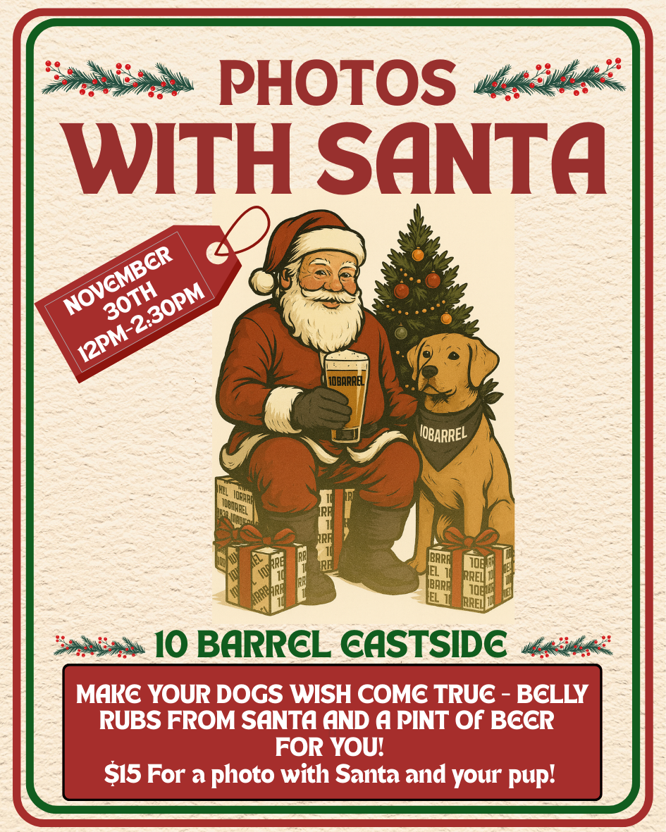 10 Barrel Eastside 62950 NE 18th St, BendCome join the fun and get your photo taken with the one and only, Santa. On November 30th from 12pm-2:30pm he will make a special appearance here at the Eastside Pub. Bring the kids and the pups, all are welcome. $15 for a photo with Santa and your pup.